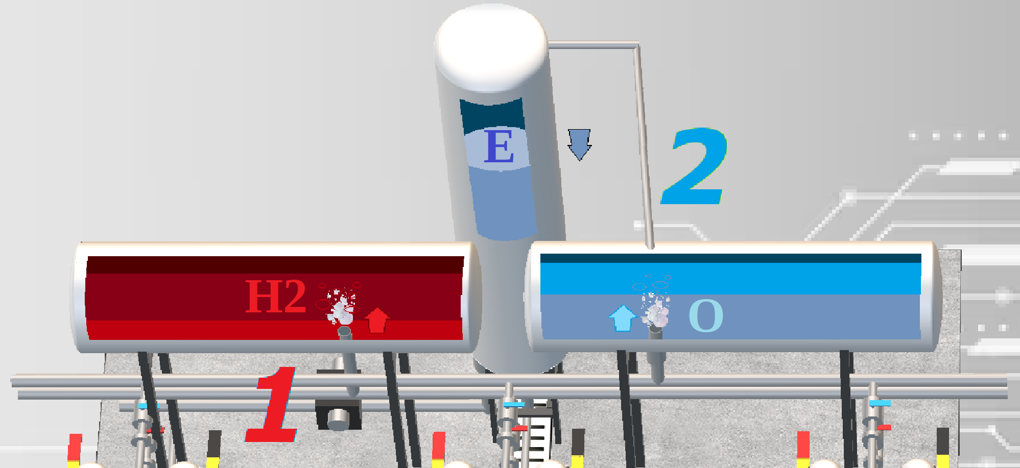 El electrolito (E) siempre se encuentra por encima del nivel de producción de gases, estos a su vez solo pueden ascender de forma separada, hacia los contenedores de reposo (H2 y O) donde pierden la humedad. El sistema de llenado de electrolito puede realizarse de dos formas: Con el (1) se representa la localización de una bomba de reabastecimiento. Con el (2) se muestra una conducción que equipara las presiones del tanque de oxígeno con el almacenamiento de electrolito hasta alcanzar los (200 bar).