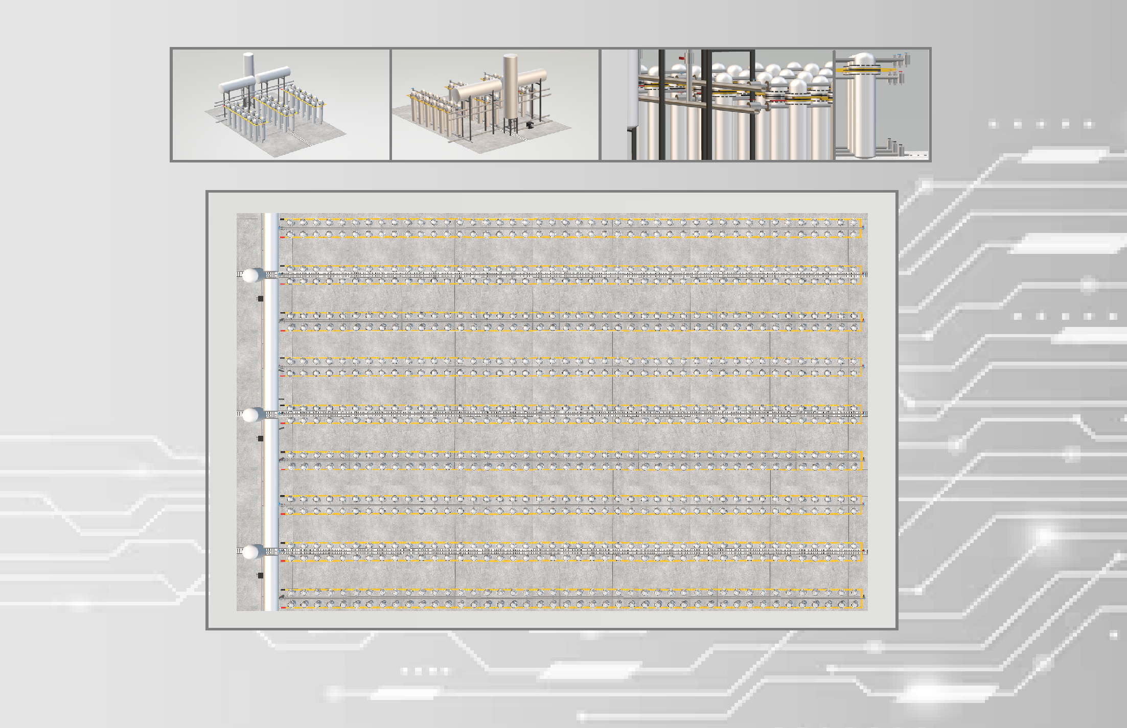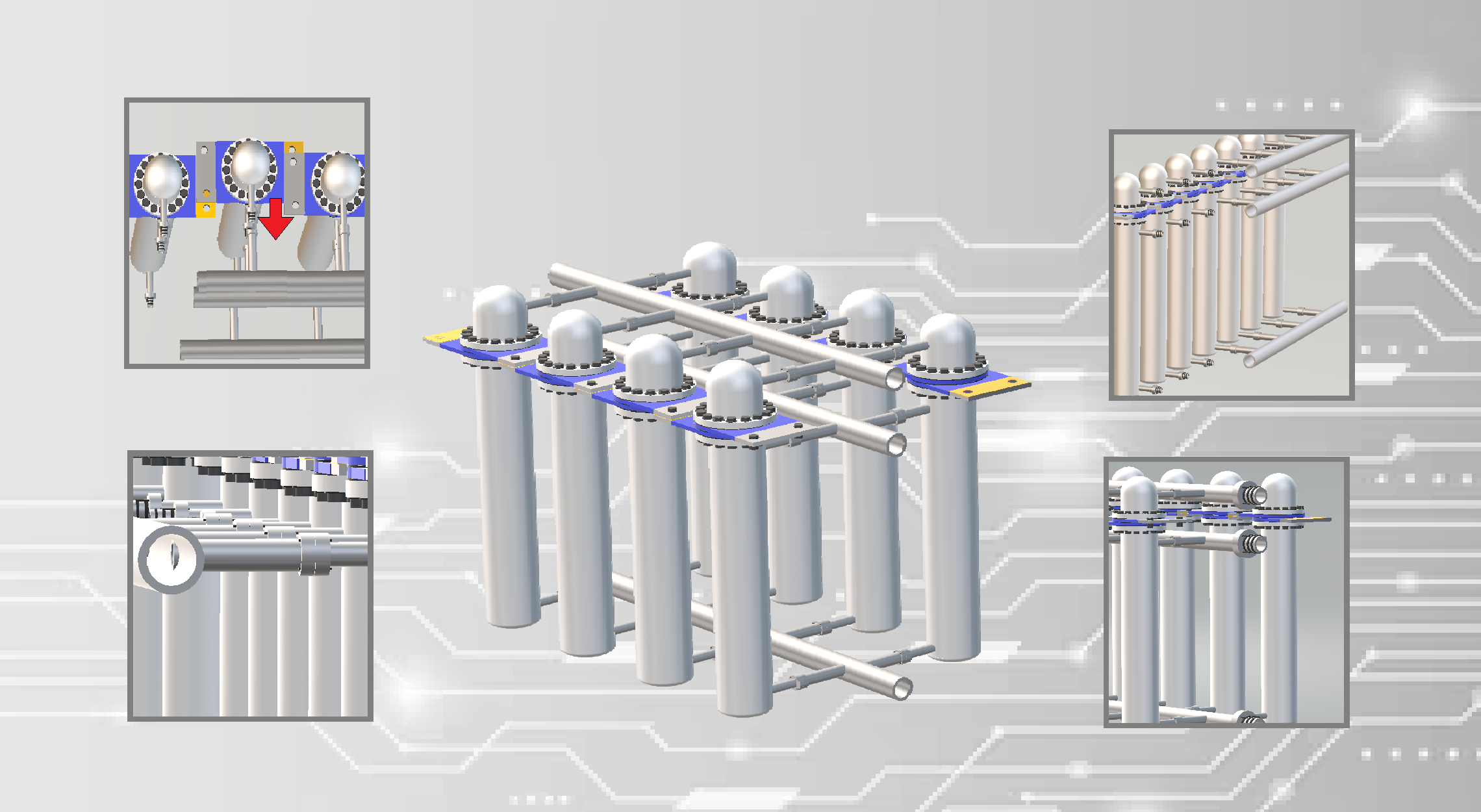 Los distintos conjuntos pueden ser apilados en altura, para ello solo hay que tener en cuenta mantener el tanque de electrolito y los depósitos de reposo por encima del nivel de los generadores, siempre y cuando se respete la mecánica de fluidos el sistema puede crecer en altura.