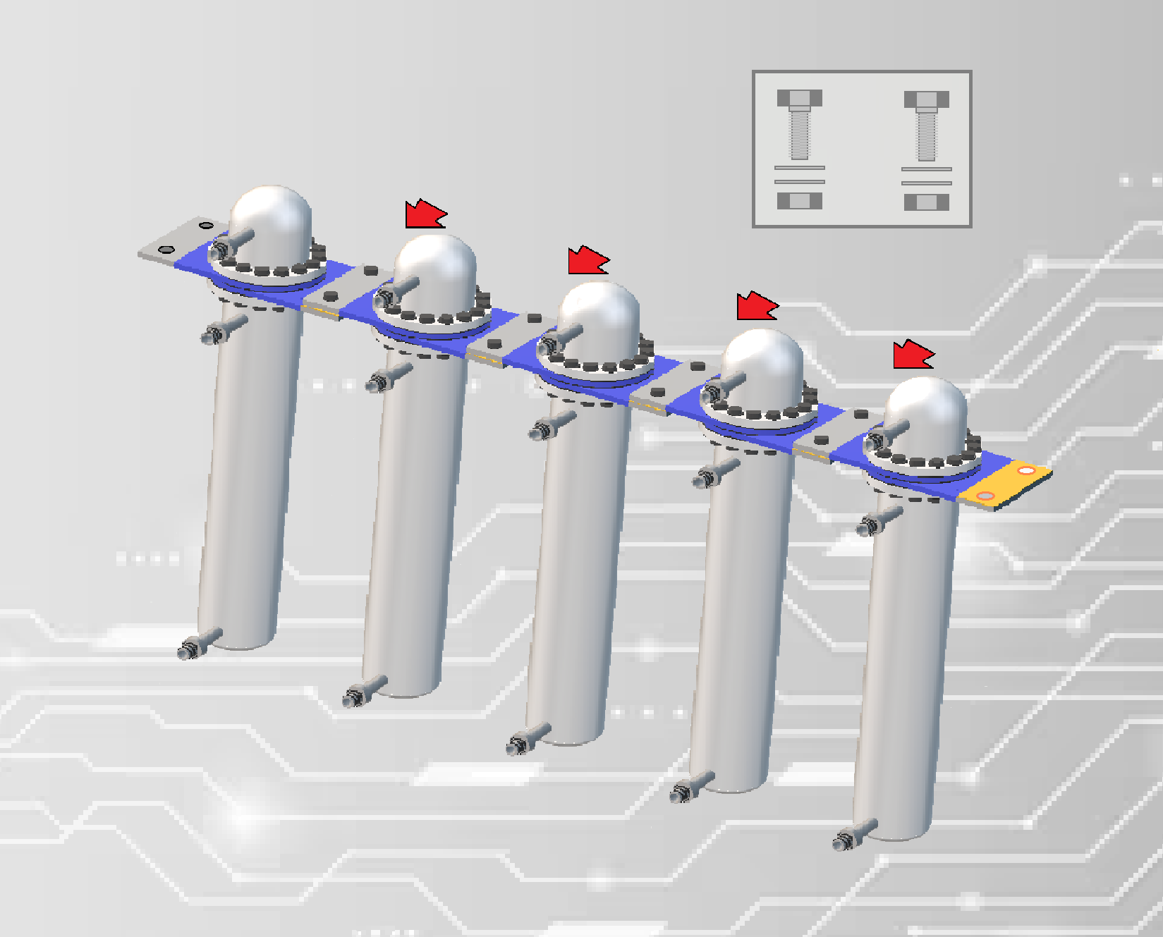 Al final de un conjunto se conectan sistemas de purga para el mantenimiento y un puente eléctrico que cierra el contacto entre líneas para dar continuidad de corriente.